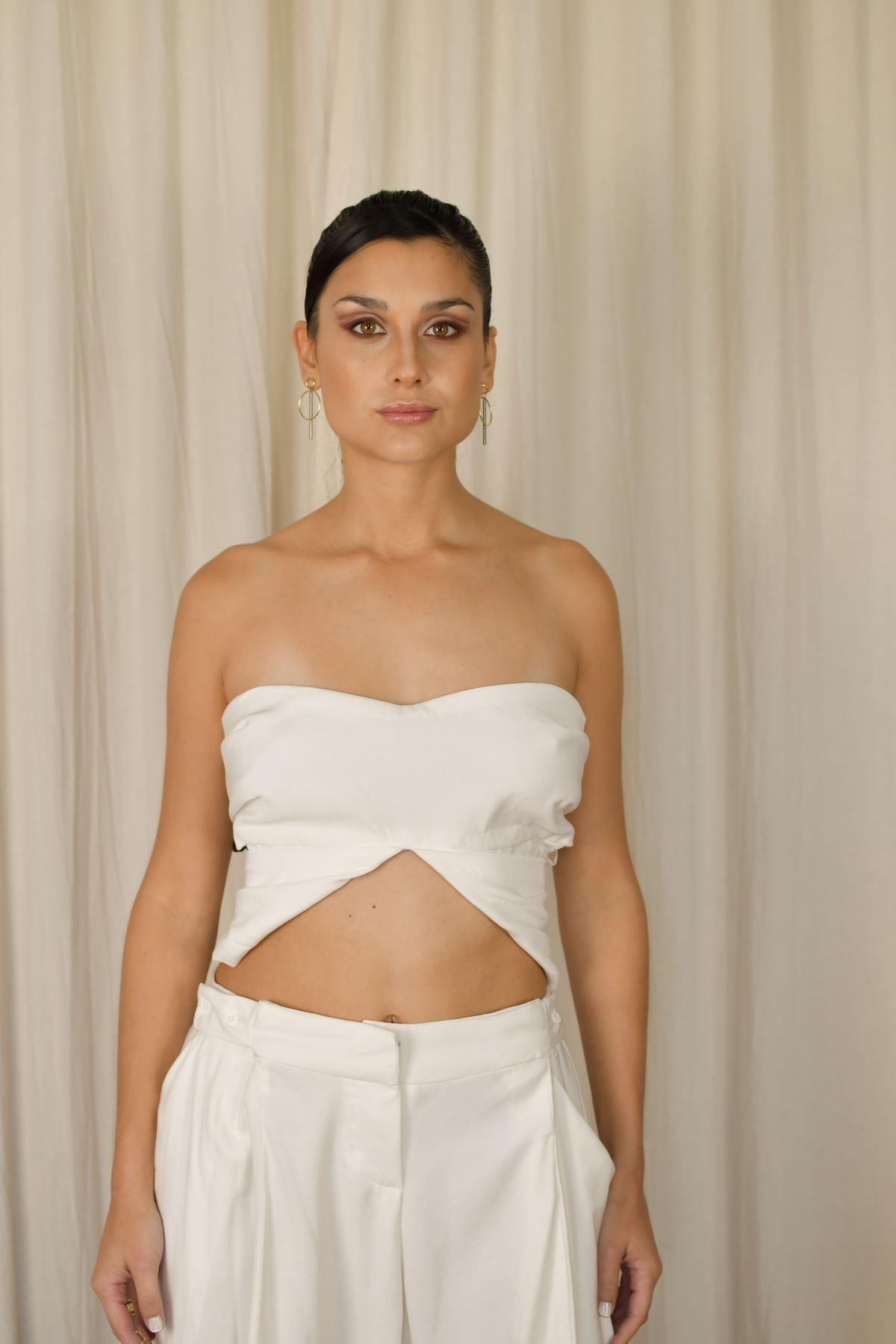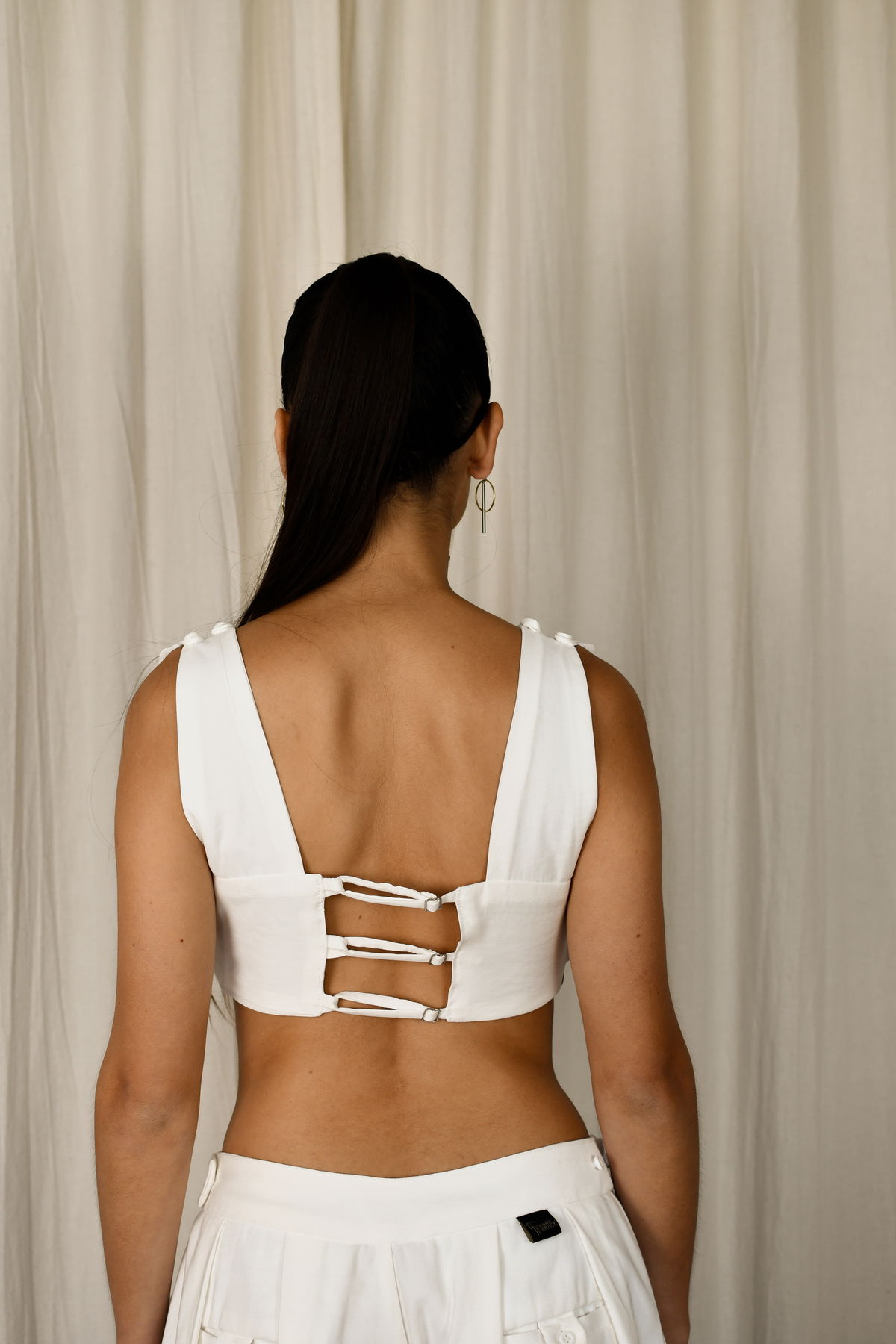 Descripción: Top corto con breteles anchos para transformar la forma de uso. Tiras con reguladores en la espalda. Textil suave al tacto. Terminación embolsada en el busto para que no transparente. Presenta ojales en los breteles delanteros y botones en los breteles de la espalda, asi como tambien una tira aparte para pasar por los ojales y hacer mas variantes.