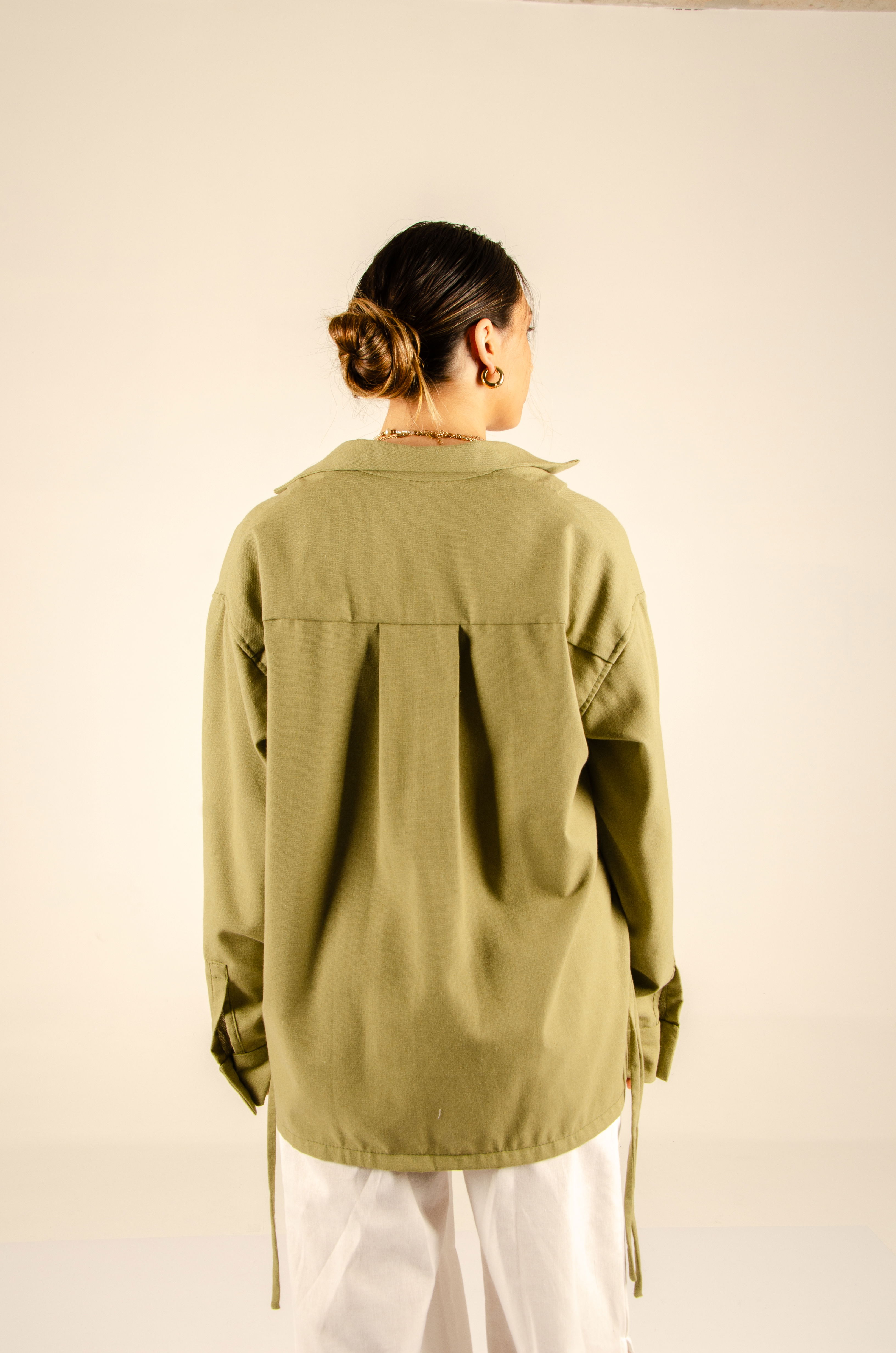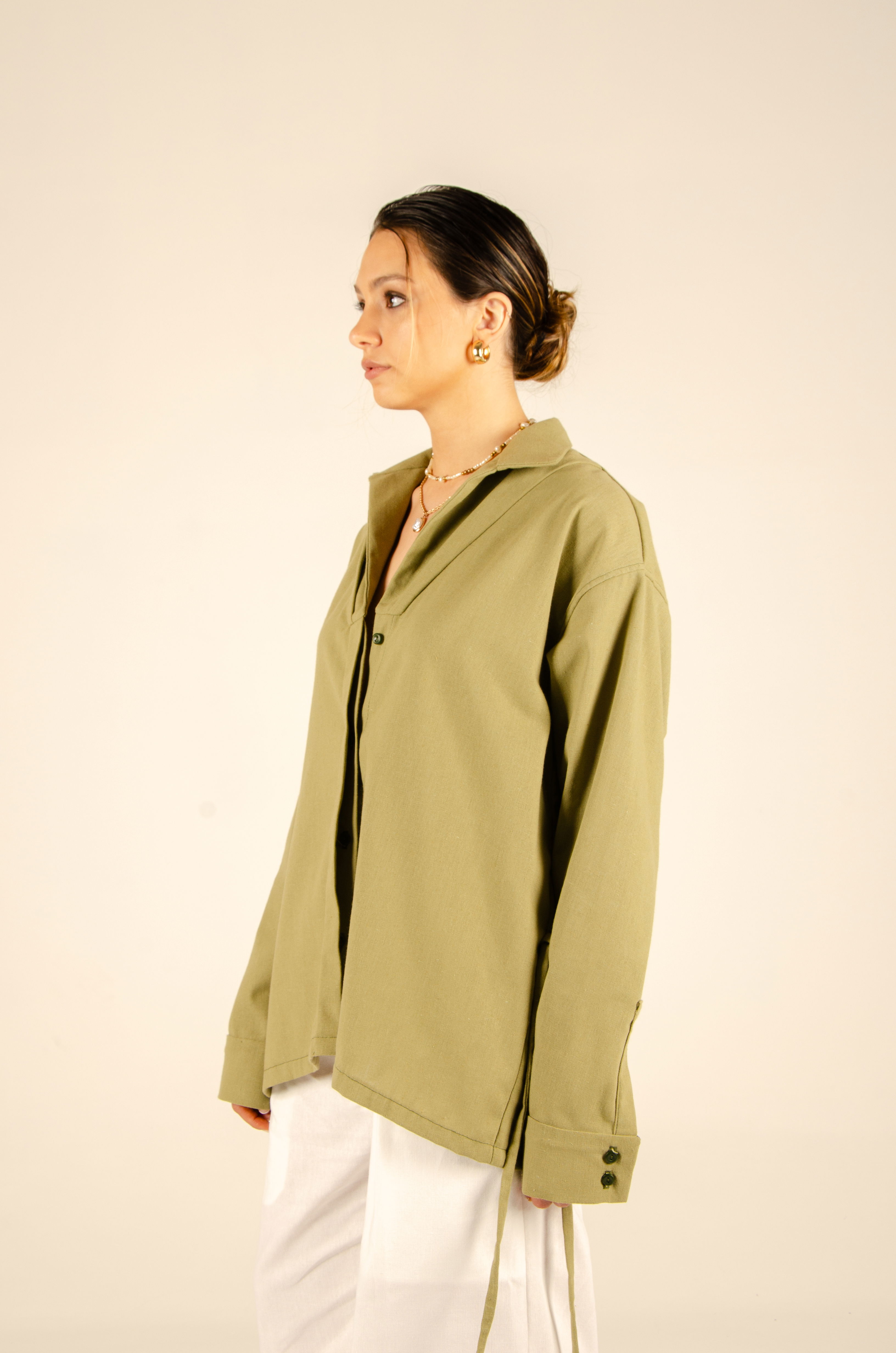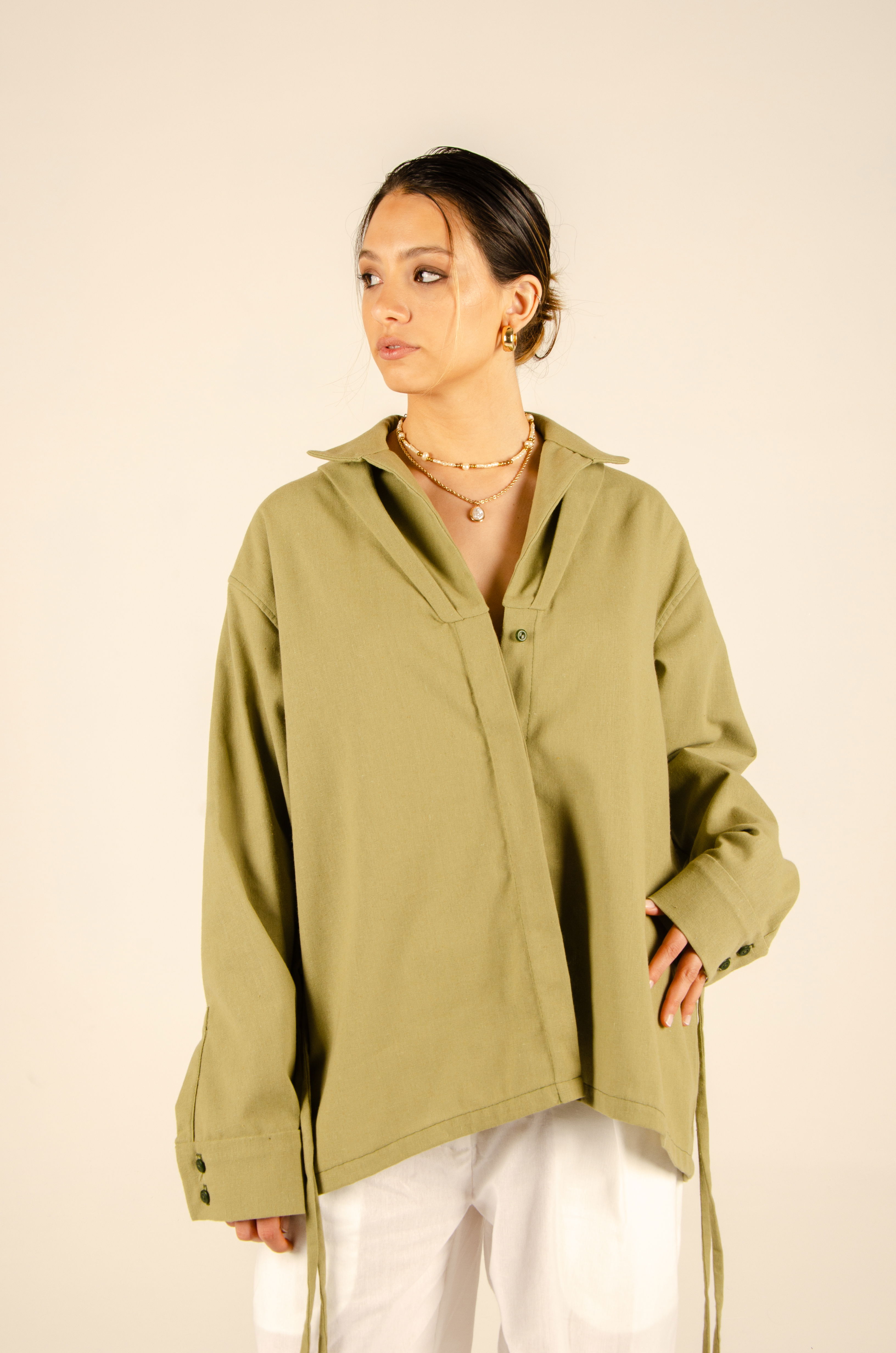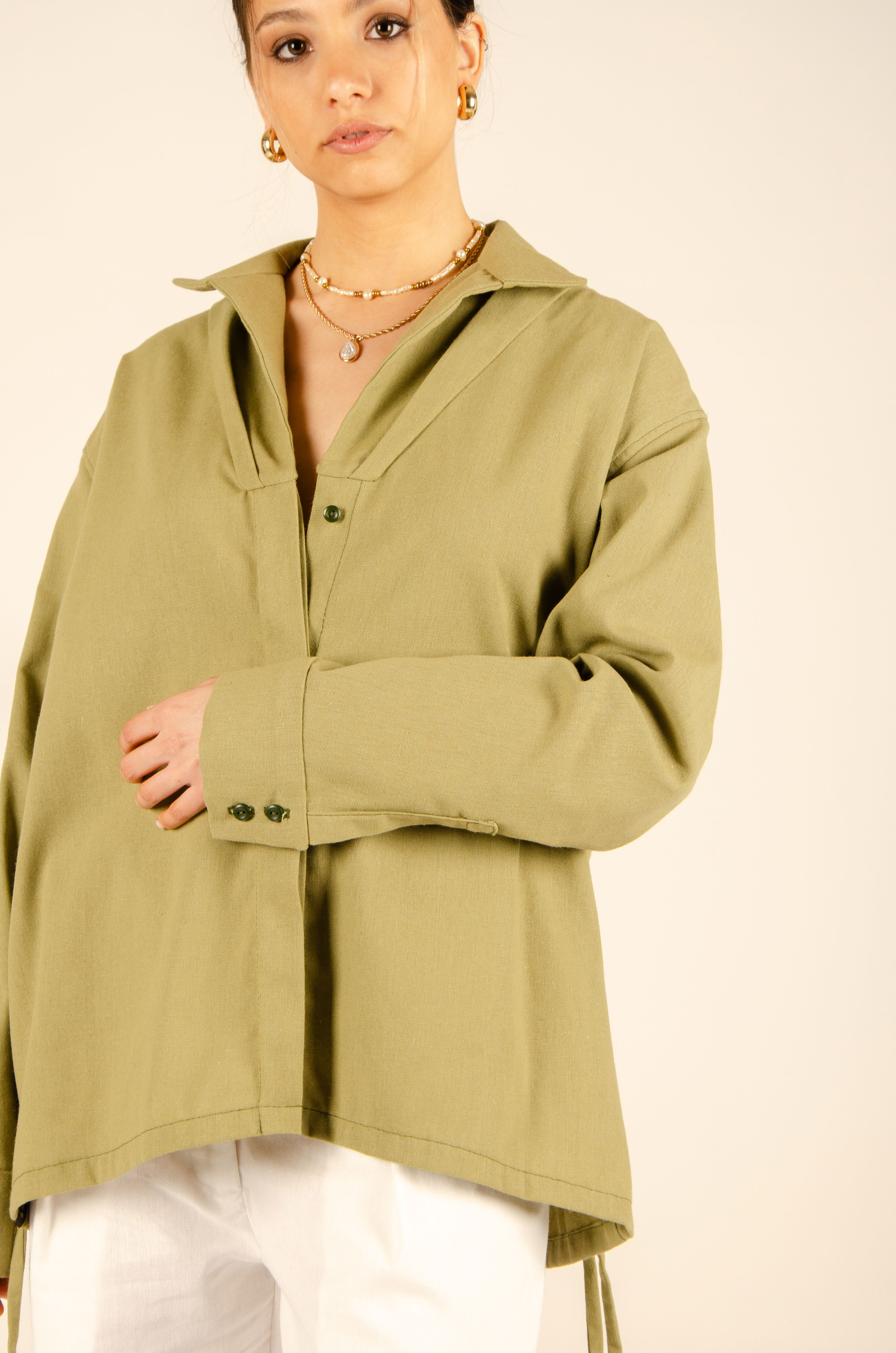 Camisa oversize con largo hasta la cadera. Tiene cartera de botones escondida en el centro delantero, mangas largas y cuello tipo polo. Posee ojales en sus laterales con tiras que permiten ajustarla a la cintura y cambiar su forma. Textil lino liviano y suave con estructura. Cuello entretelado.