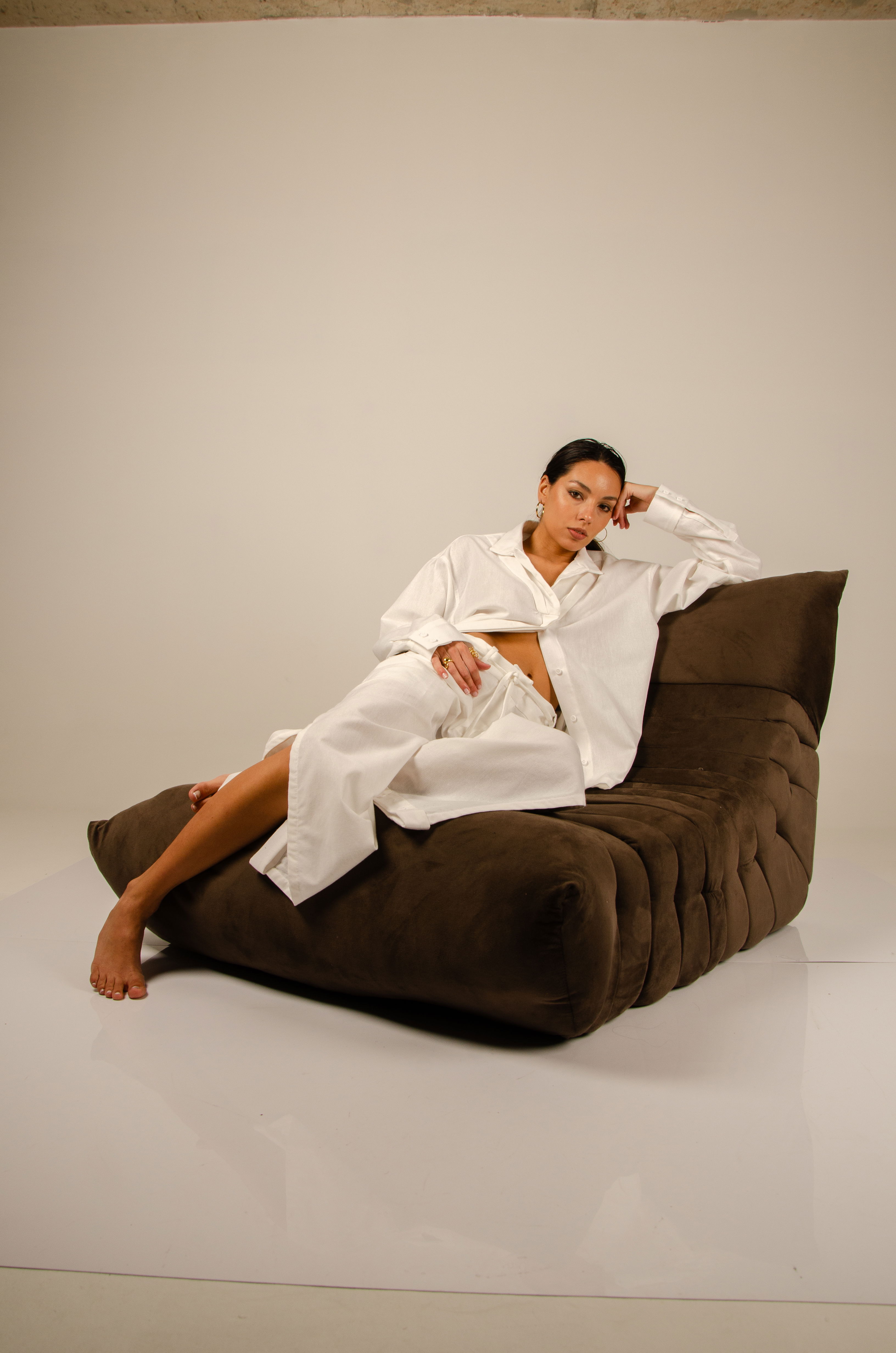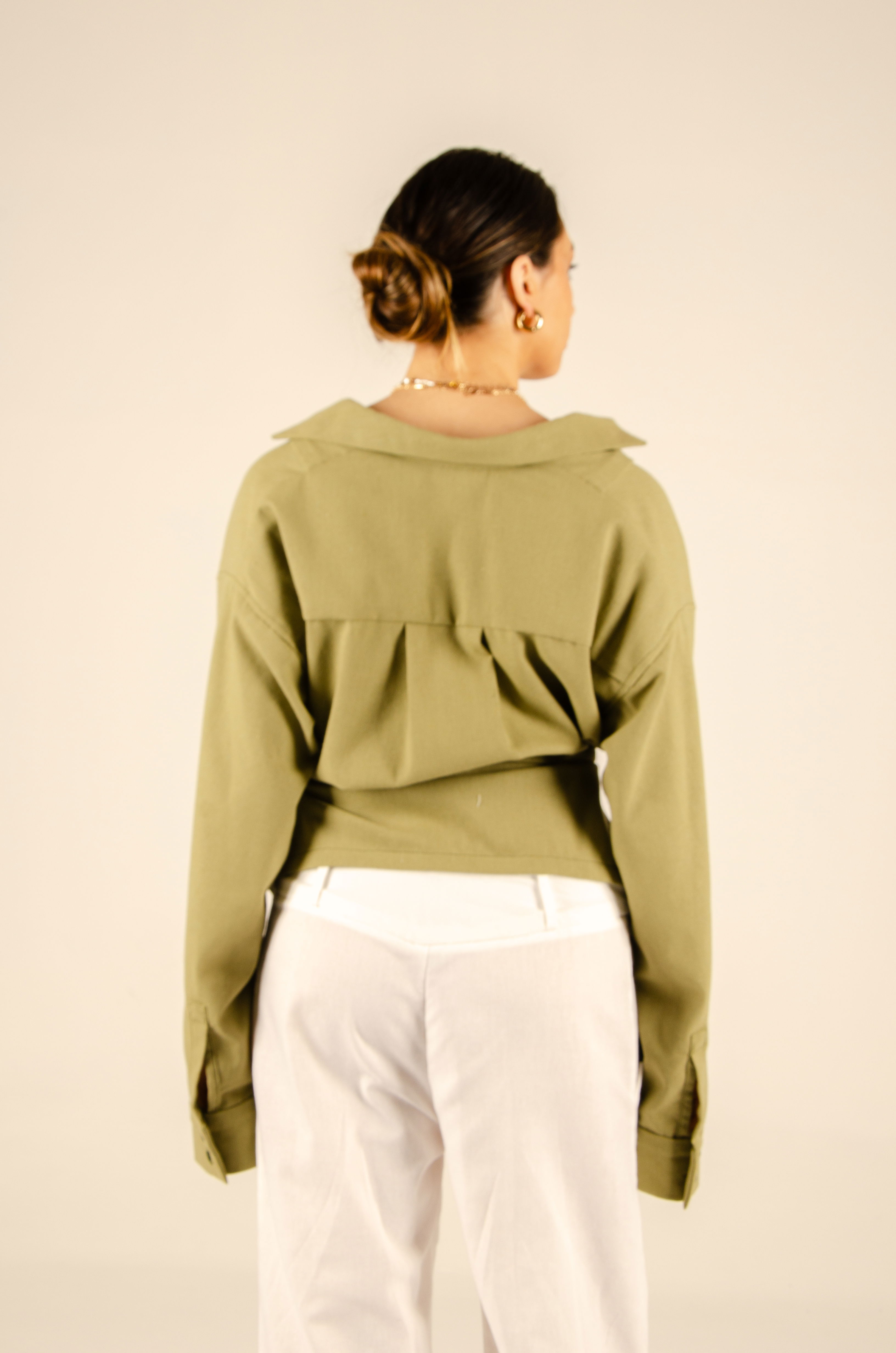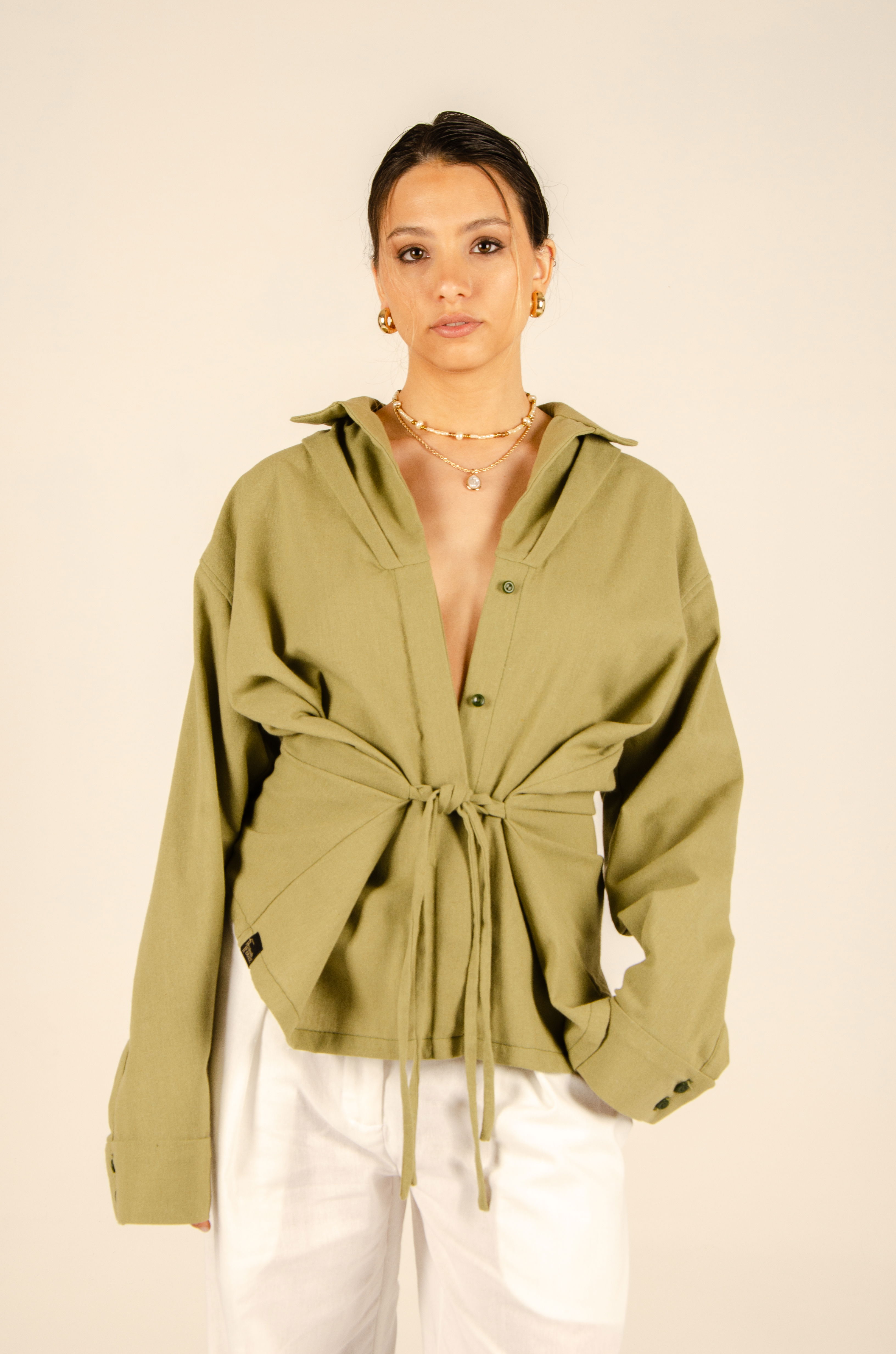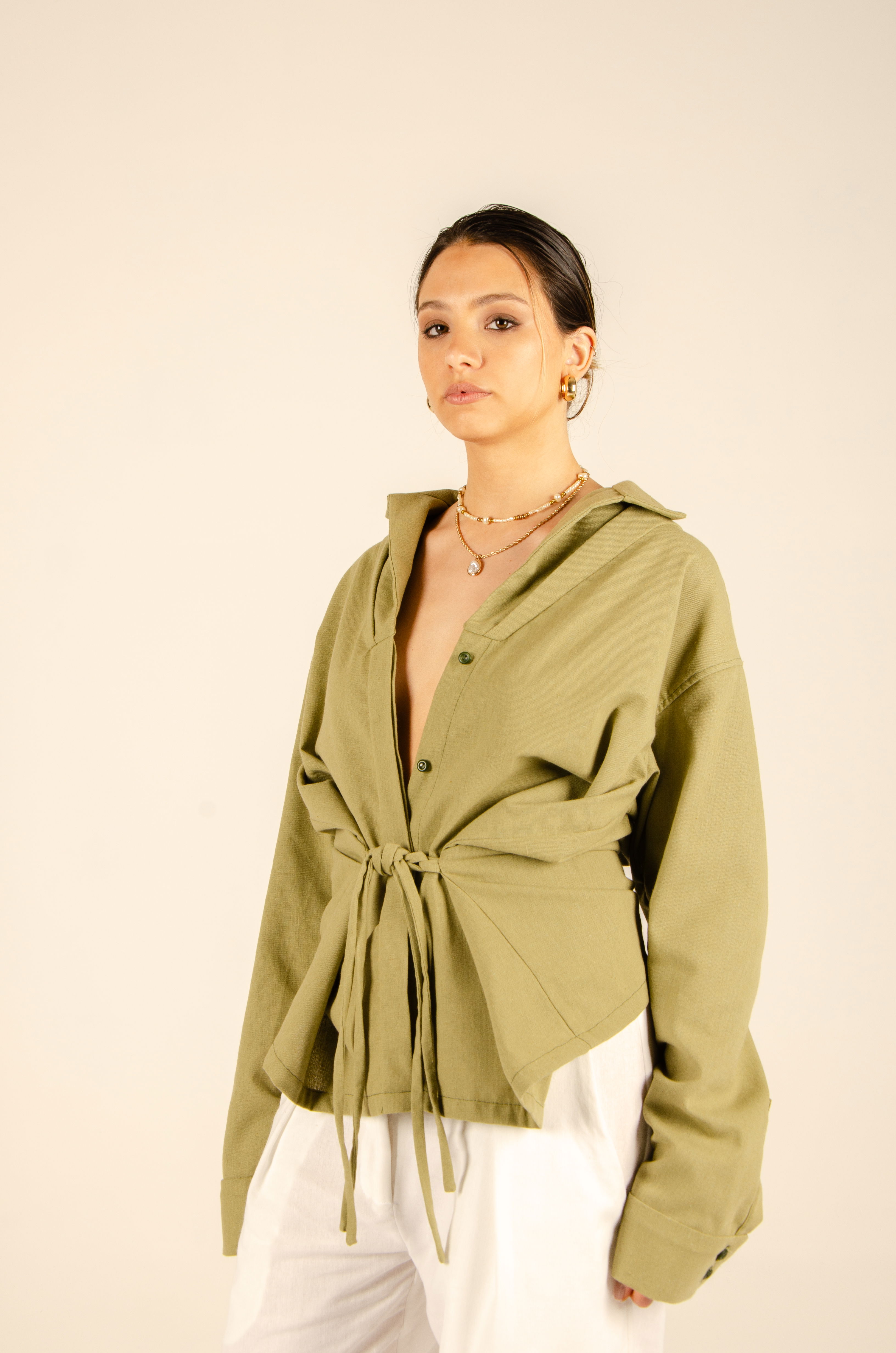 Camisa oversize con largo hasta la cadera. Tiene cartera de botones escondida en el centro delantero, mangas largas y cuello tipo polo. Posee ojales en sus laterales con tiras que permiten ajustarla a la cintura y cambiar su forma. Textil lino liviano y suave con estructura. Cuello entretelado.