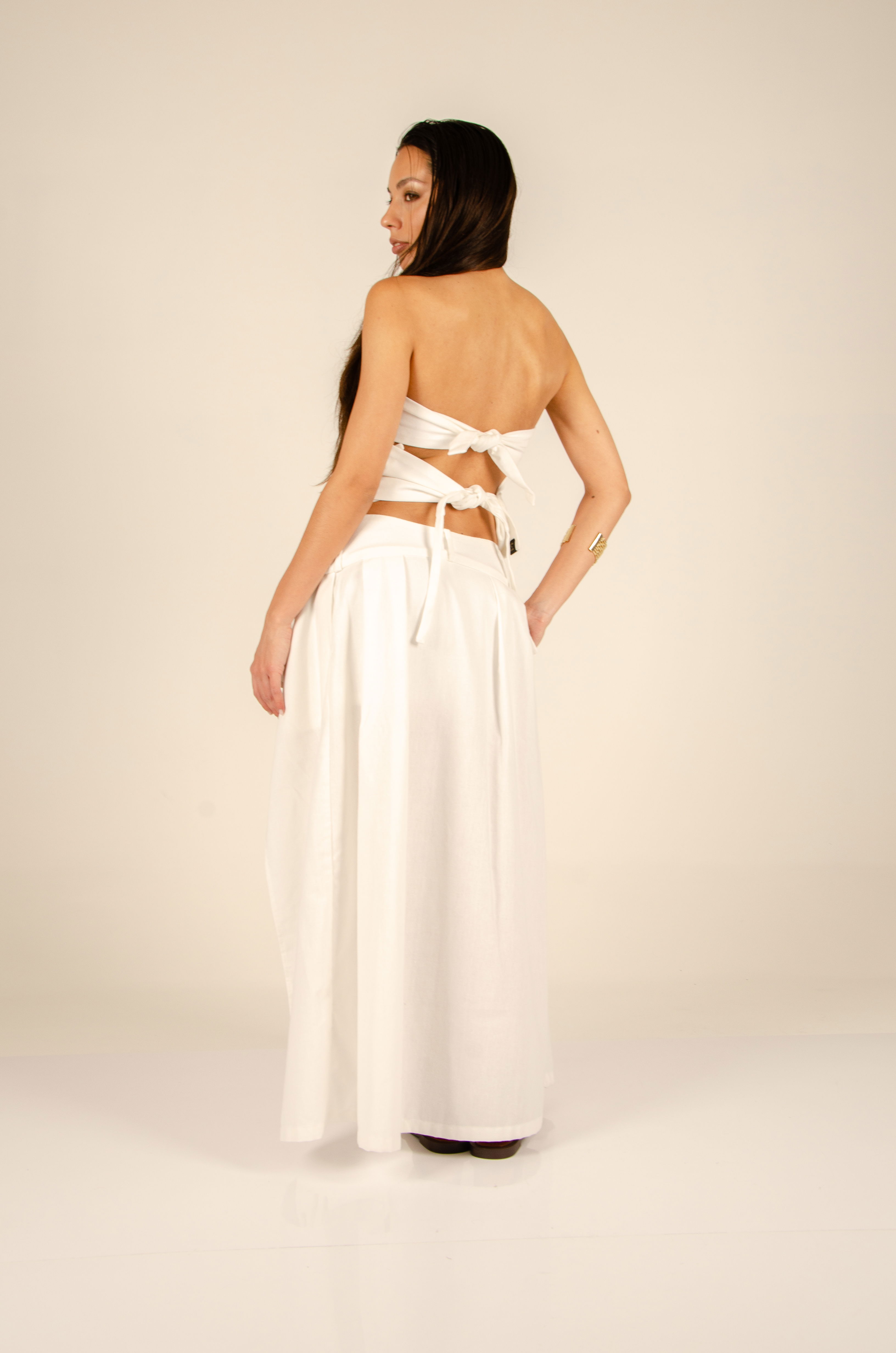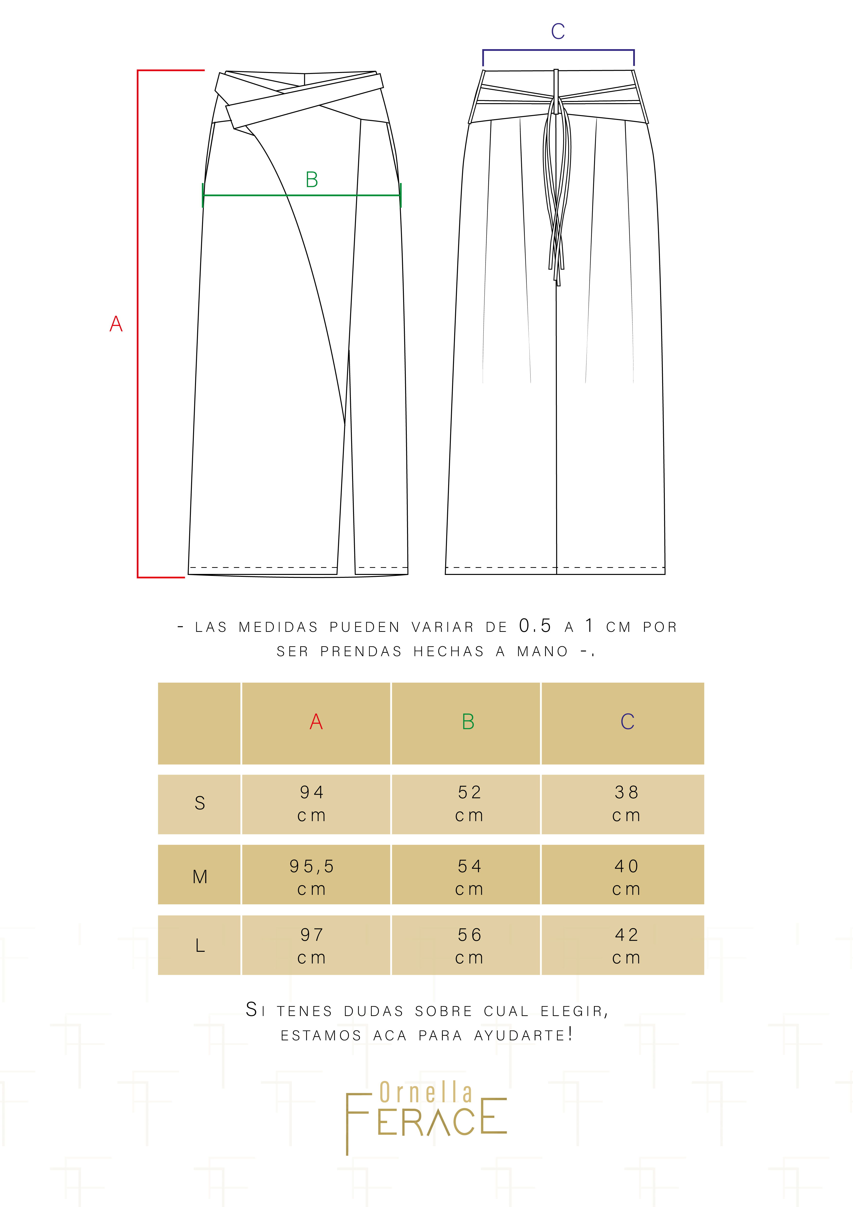 Falda evasé con largo hasta los tobillos. Tiene tablas encontradas en la espalda. Tiro medio. Posee bolsillos invisibles en los laterales. Puede utilizarse de distintas formas segun como se la cierre en la cintura. Tiene un short en la parte interior para que no transparente y sea mas funcional. Textil lino liviano y suave con estructura.