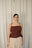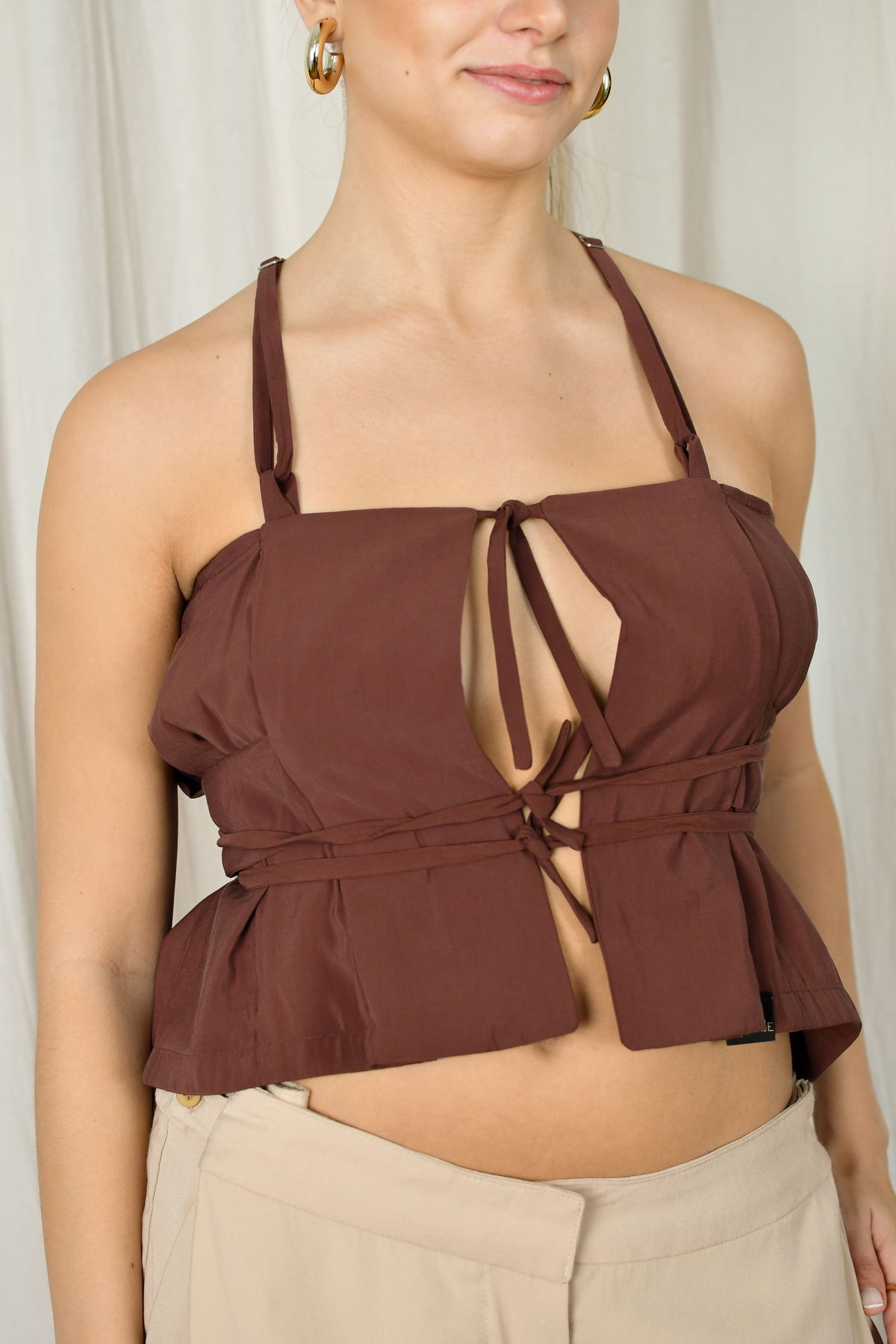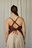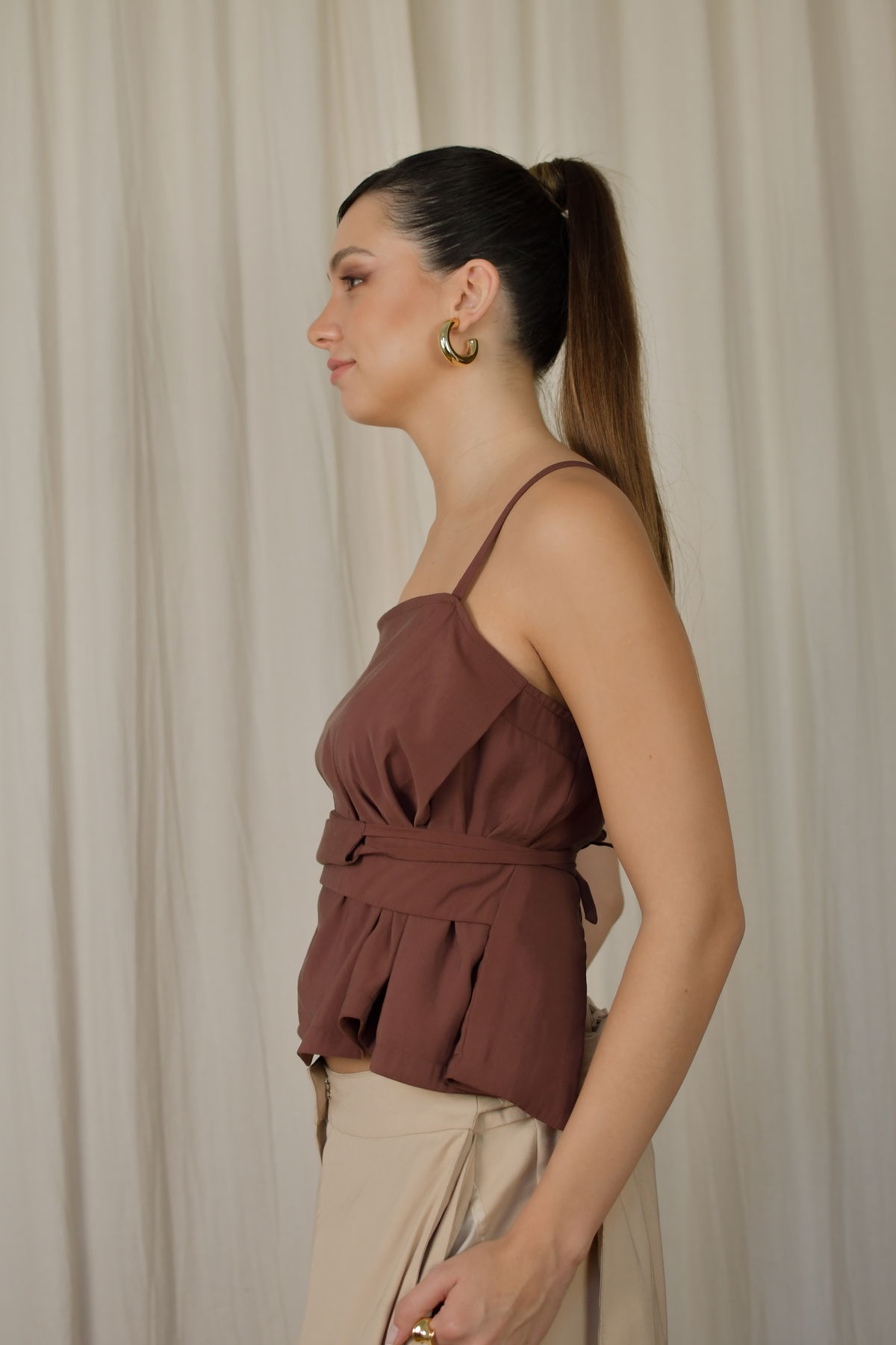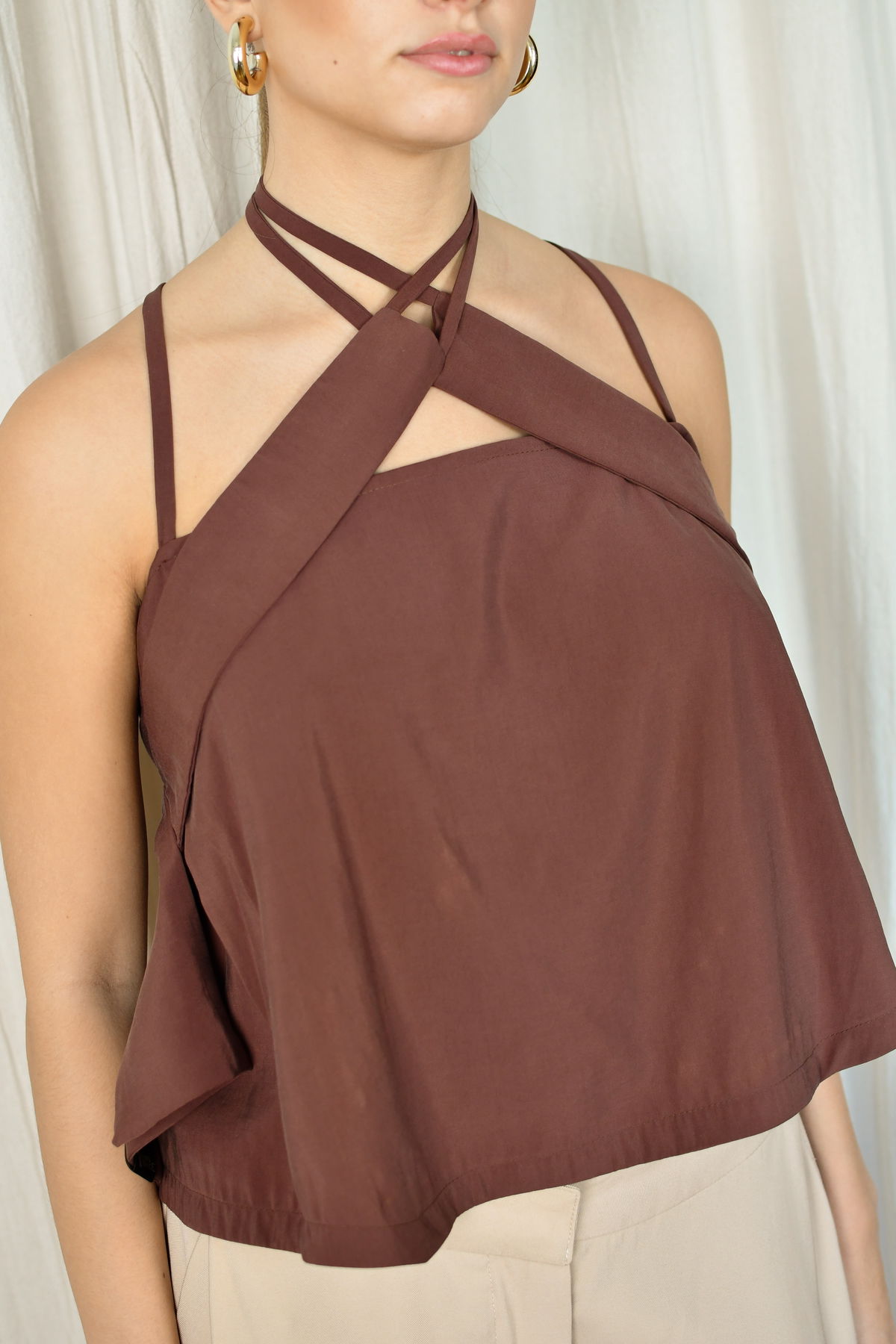 Descripción: Top con largo por debajo de la cintura, con breteles regulables y cintura ancha para transformar el uso. Espalda con breteles cruzados y abierta. Tablas en los laterales. Textil suave al tacto, no transparenta.
