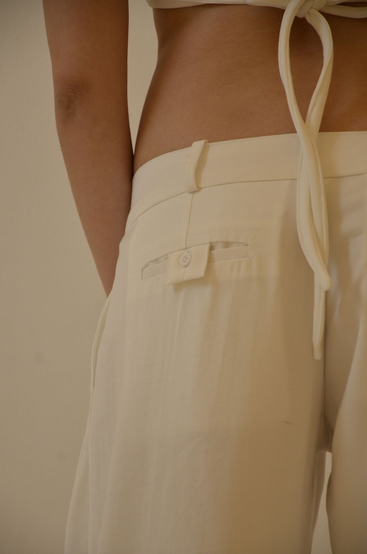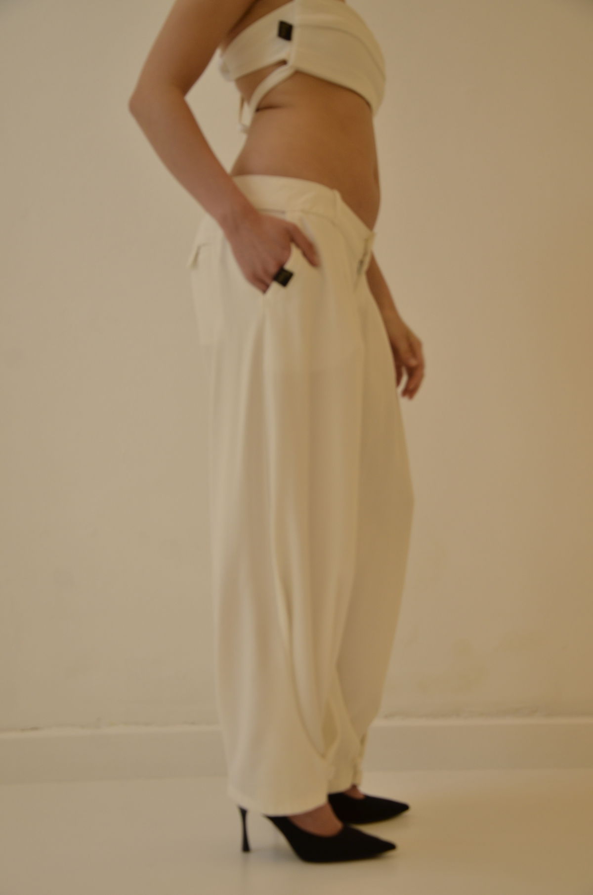 Descripción: Pantalón sastrero tiro bajo, con bolsillos y pinzas en el delantero, y bolsillos ojales en la espalda con cerramiento de botones. Tiene botones y ojales en los puños para variar su uso a gusto. Cintura ancha con presillas. Suave al tacto, textura sargada.