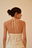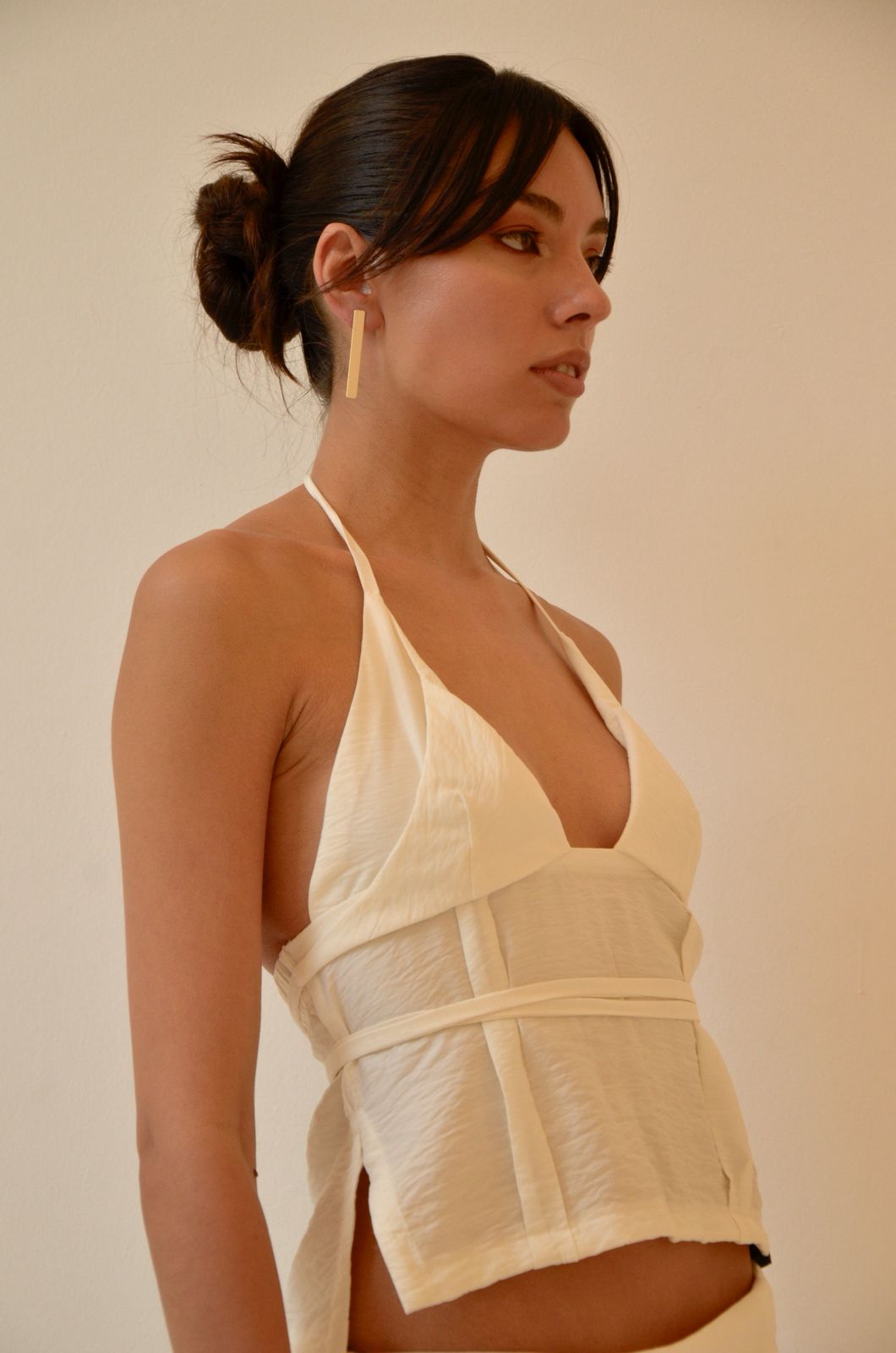 Descripción: Top largo recto con tablas encontradas en el delantero, tajos laterales, elástico en espalda y tazas de busto triangulares con breteles que permiten variar la forma de uso. La tela es fina y transparenta pero el busto presenta terminación embolsada con doble tela para que no se vea. Suave al tacto, con textura flamé. Ingreso por la cabeza.