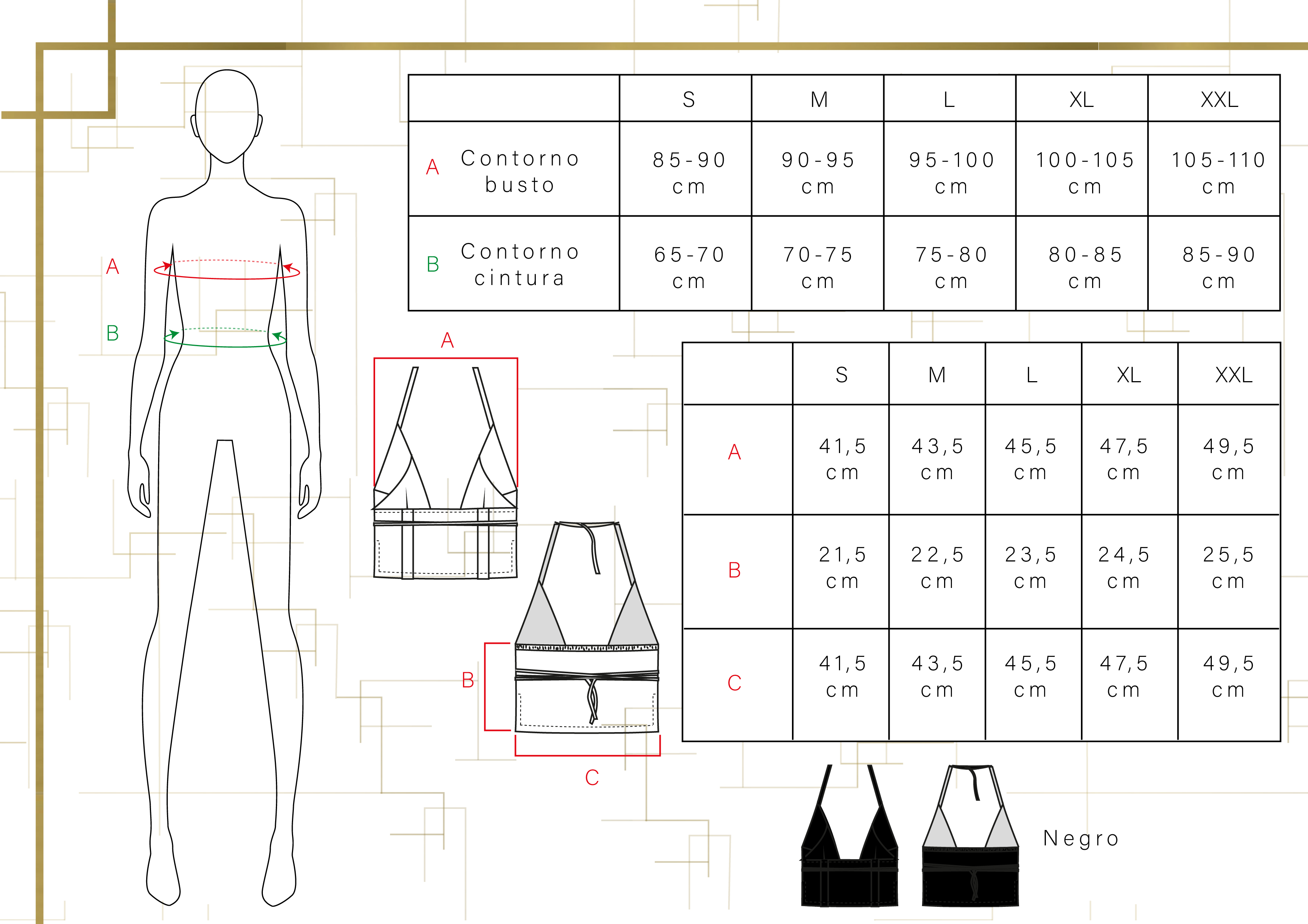 La modelo está usando un talle S y tiene un contorno de busto de 82 cm.