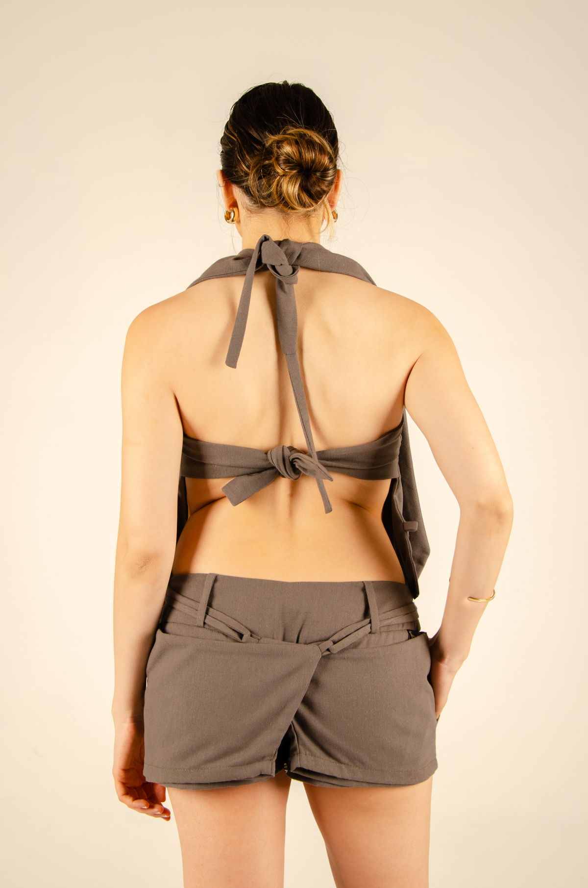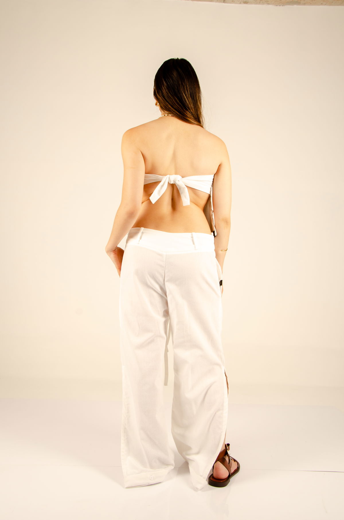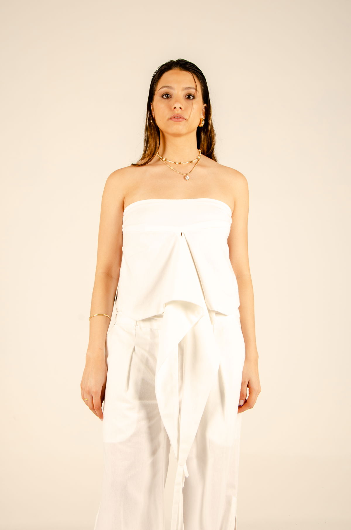 Top largo que se ata en la espalda y el cuello. Se puede usar de distintas formas dependiendo como se lo coloque. Se encuentra embolsado para que no transparente. Textil liviano y suave con estructura. Ideal para usar en distintas ocasiones dependiendo como se lo estilee.