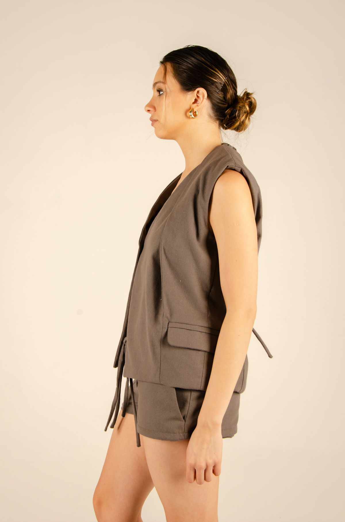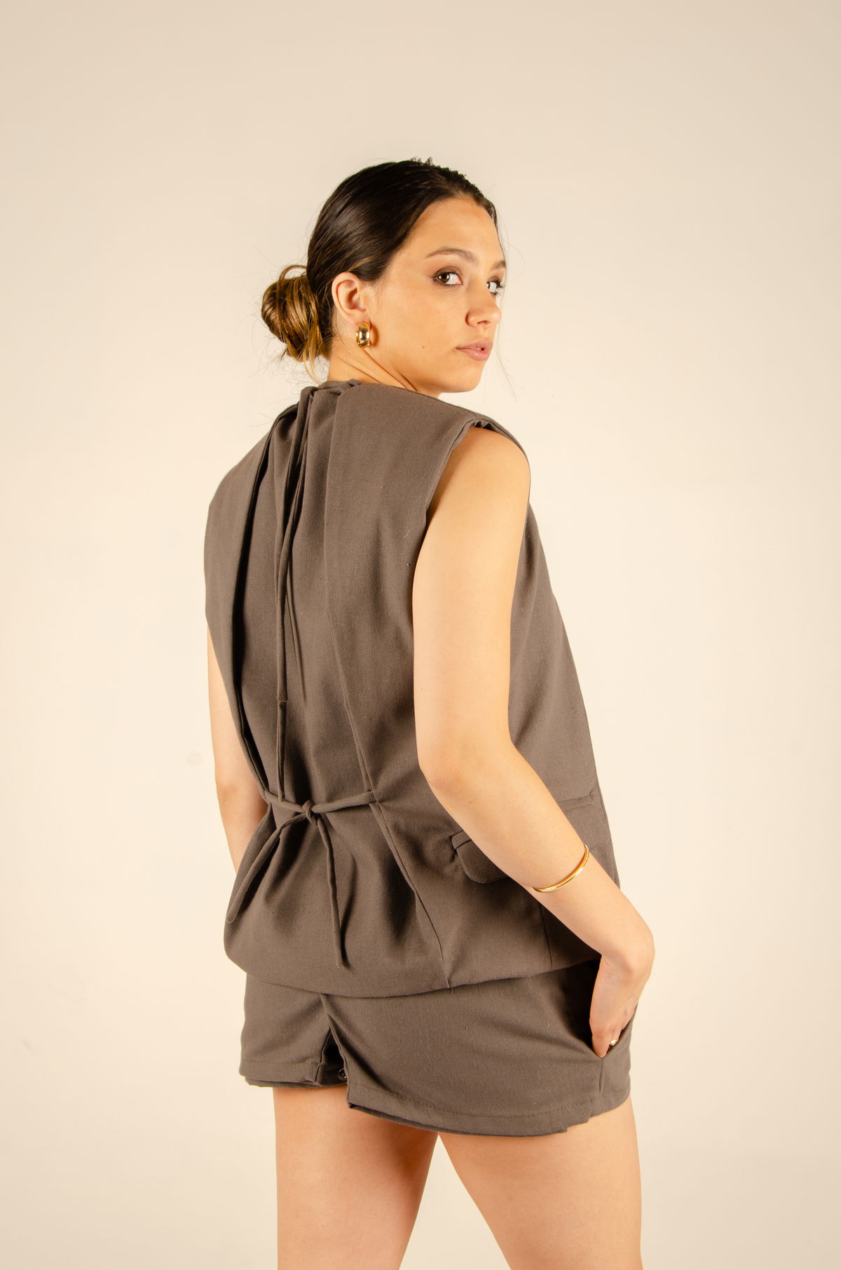 Chaleco con largo hasta la cadera forrado por completo. Posee bolsillos con tapa en los laterales delanteros. Los hombros pueden agrandarse o achicarse a gusto. Textil de lino liviano y suave con estructura.